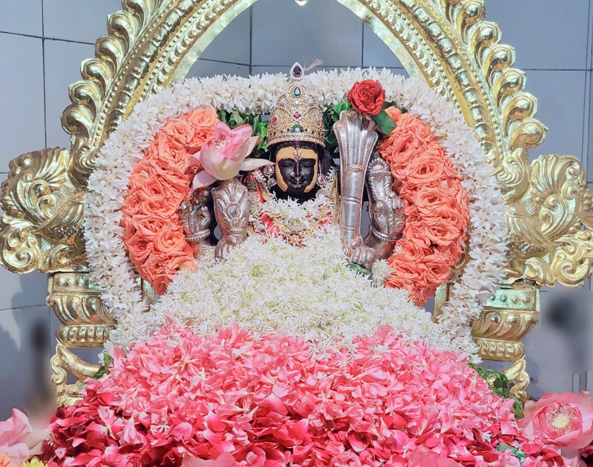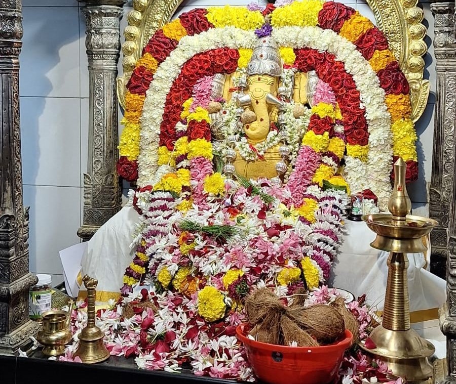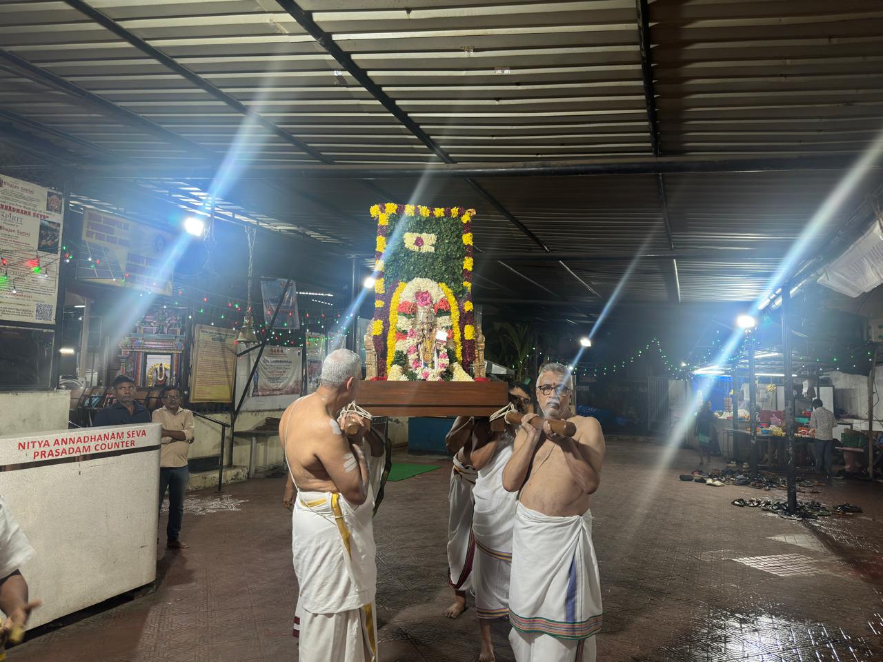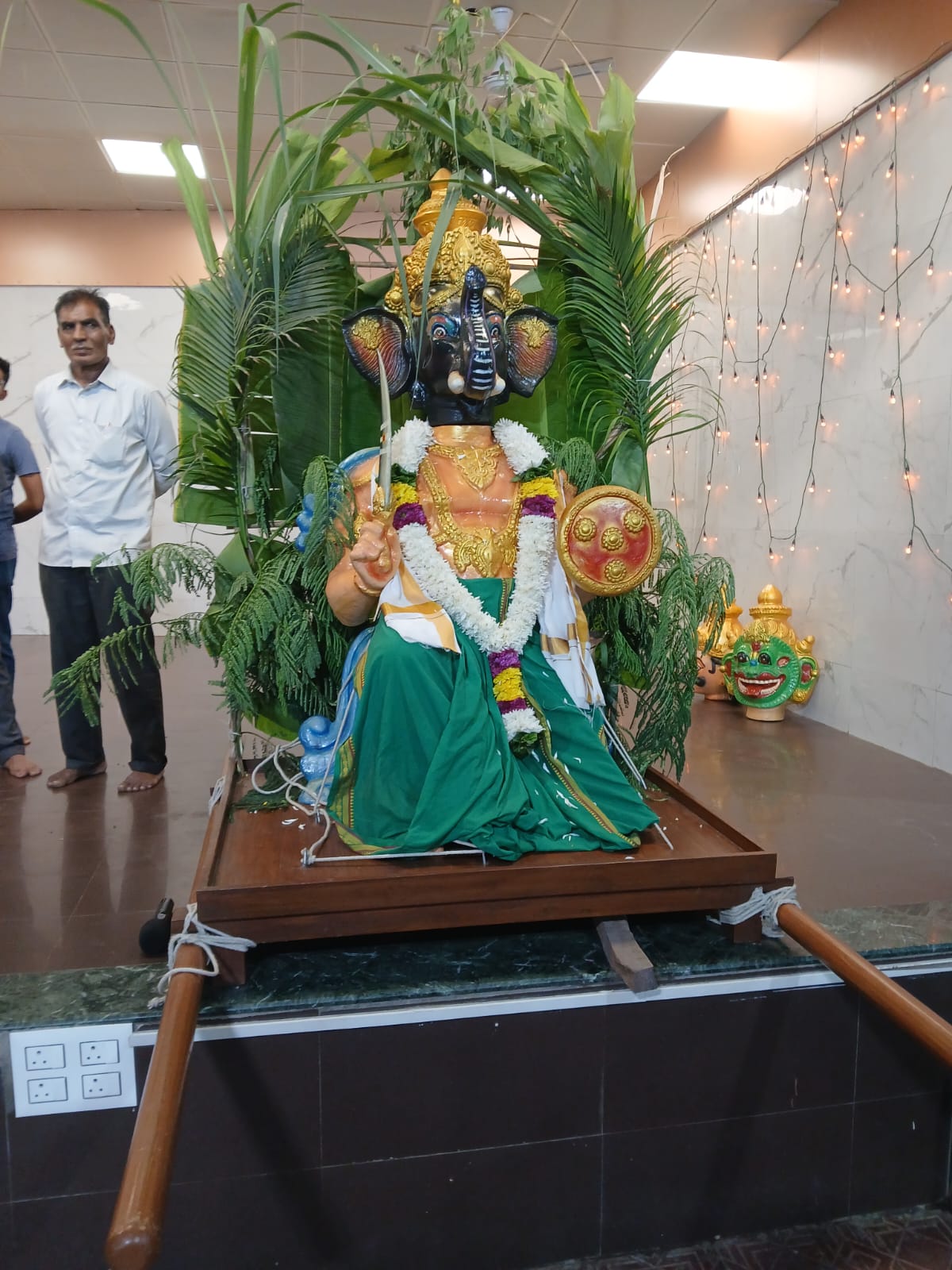 A gentleman residing in Amruth Nagar bought a large size Ganesh idol from the south and kept in his society premises to perform Pooja. The society residents objected to installation of idol in the society premises. Mr. Sridhar agreed to take the idol to the present Samaj complex and install it there. Thus this VALAMPURI VINAYAGAN (tusk on the right side) came to our complex. Later a main building was built for installing this idol, Lord Shiva (Arunachaleswarar), Sri Rama and later Guruvayurappan, Rajarajeshwari, Anjaneyar, Dakshinamoorthy & Navagrahas with their consorts and vahanas, and Murugan were added.