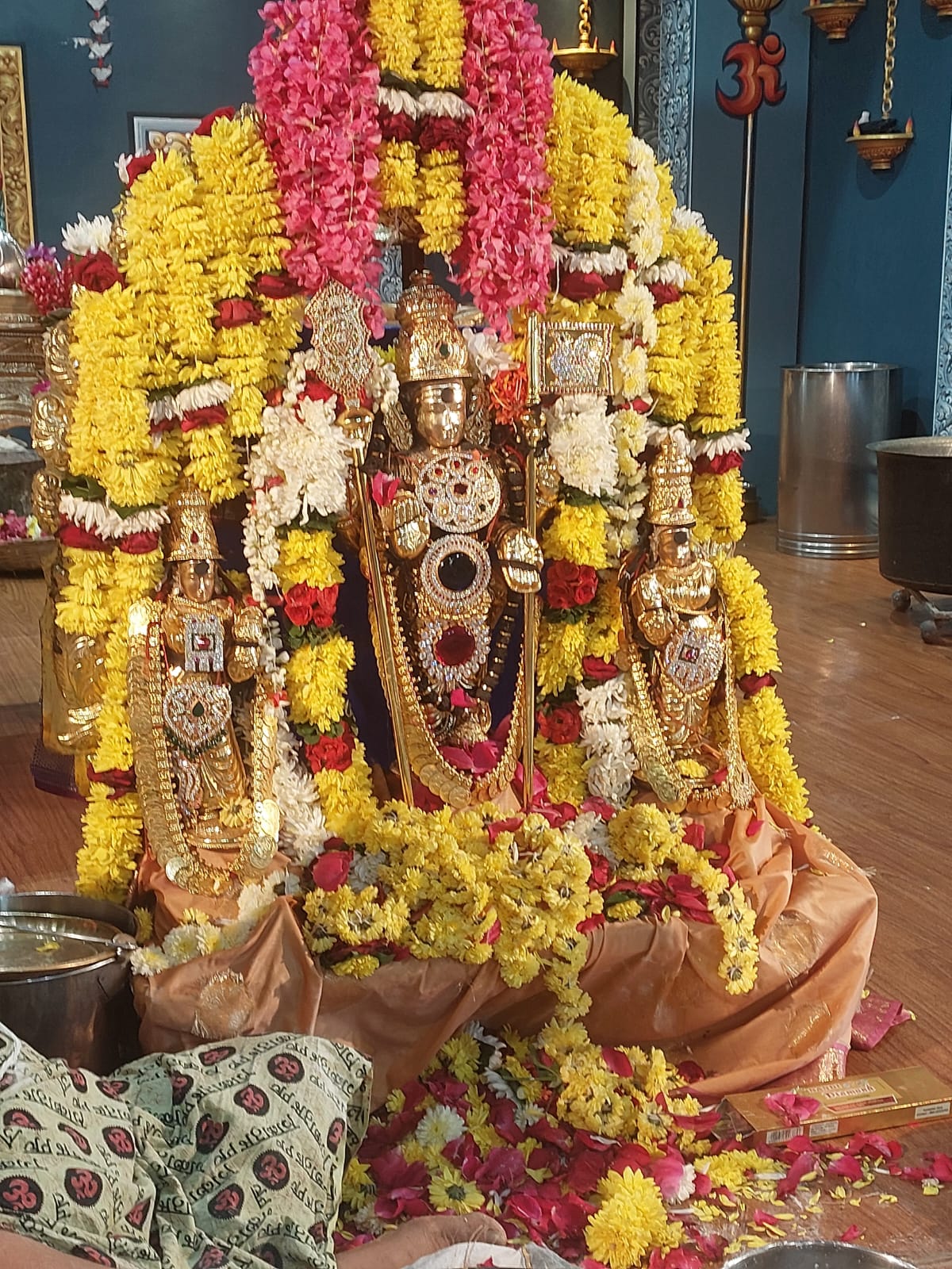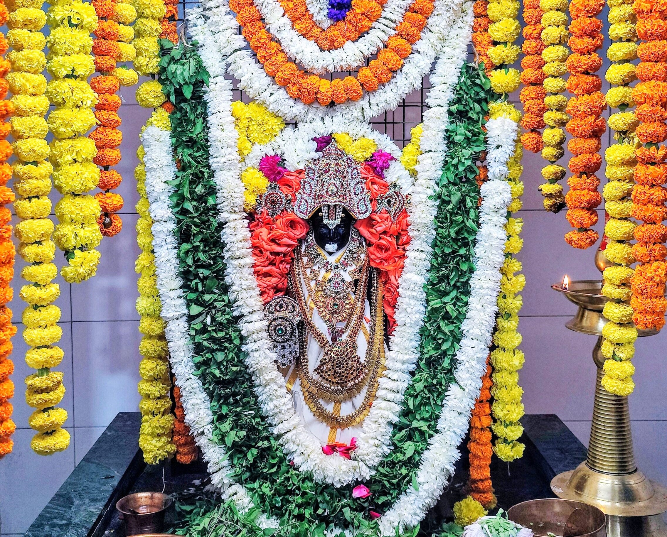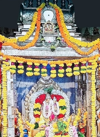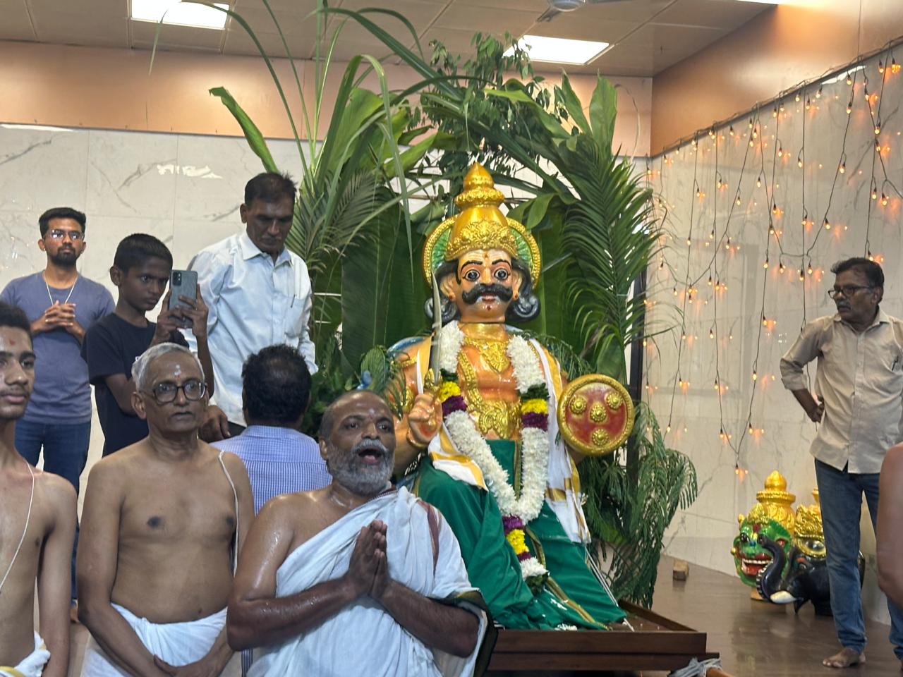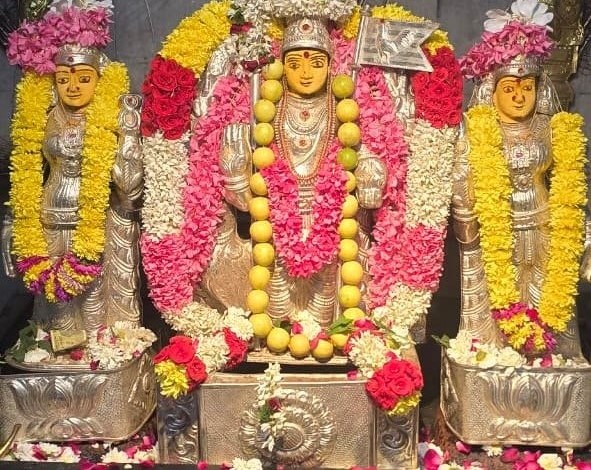 A gentleman residing in Amruth Nagar bought a large size Ganesh idol from the south and kept in his society premises to perform Pooja. The society residents objected to installation of idol in the society premises. Mr. Sridhar agreed to take the idol to the present Samaj complex and install it there. Thus this VALAMPURI VINAYAGAN (tusk on the right side) came to our complex. Later a main building was built for installing this idol, Lord Shiva (Arunachaleswarar), Sri Rama and later Guruvayurappan, Rajarajeshwari, Anjaneyar, Dakshinamoorthy & Navagrahas with their consorts and vahanas, and Murugan were added.