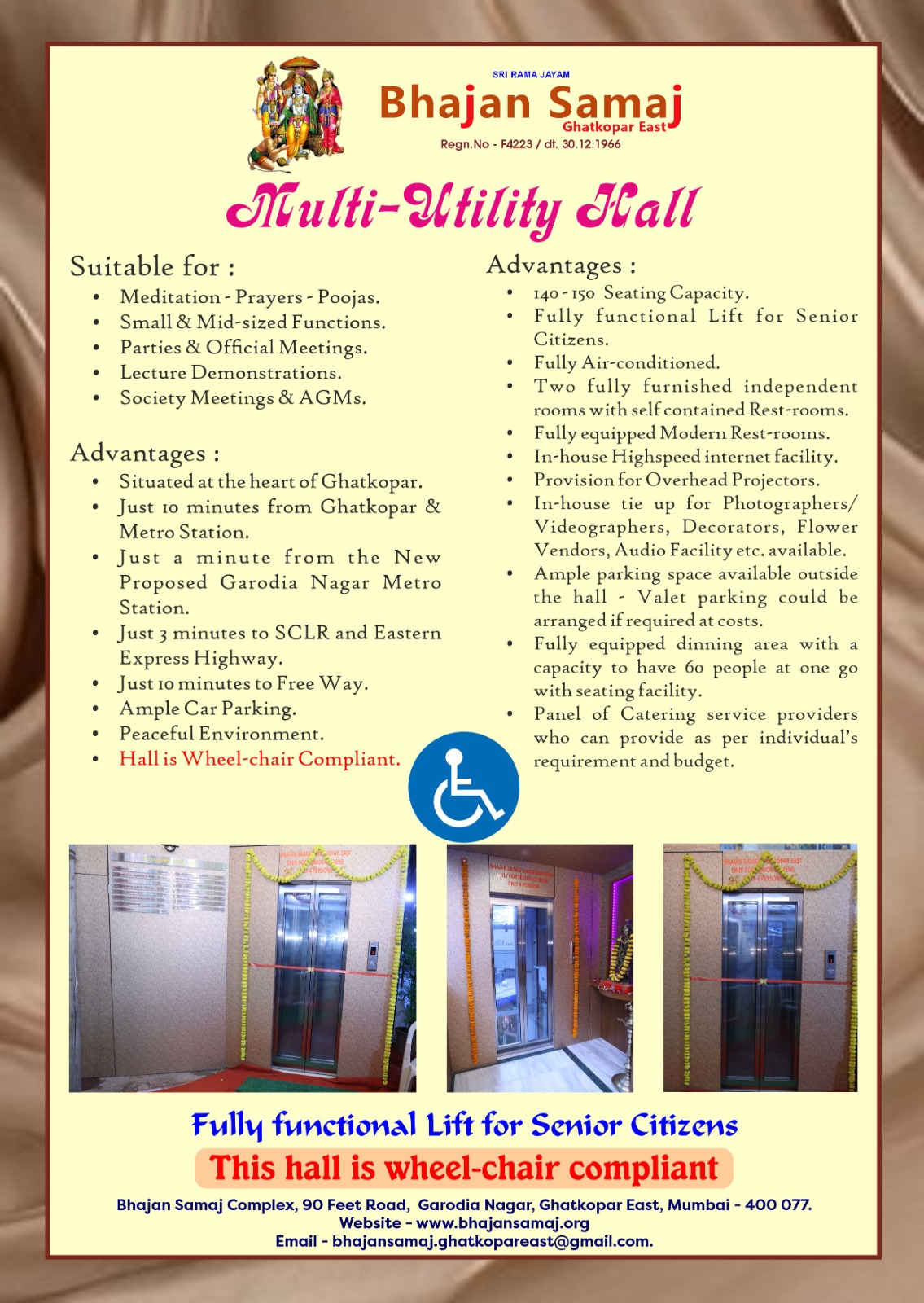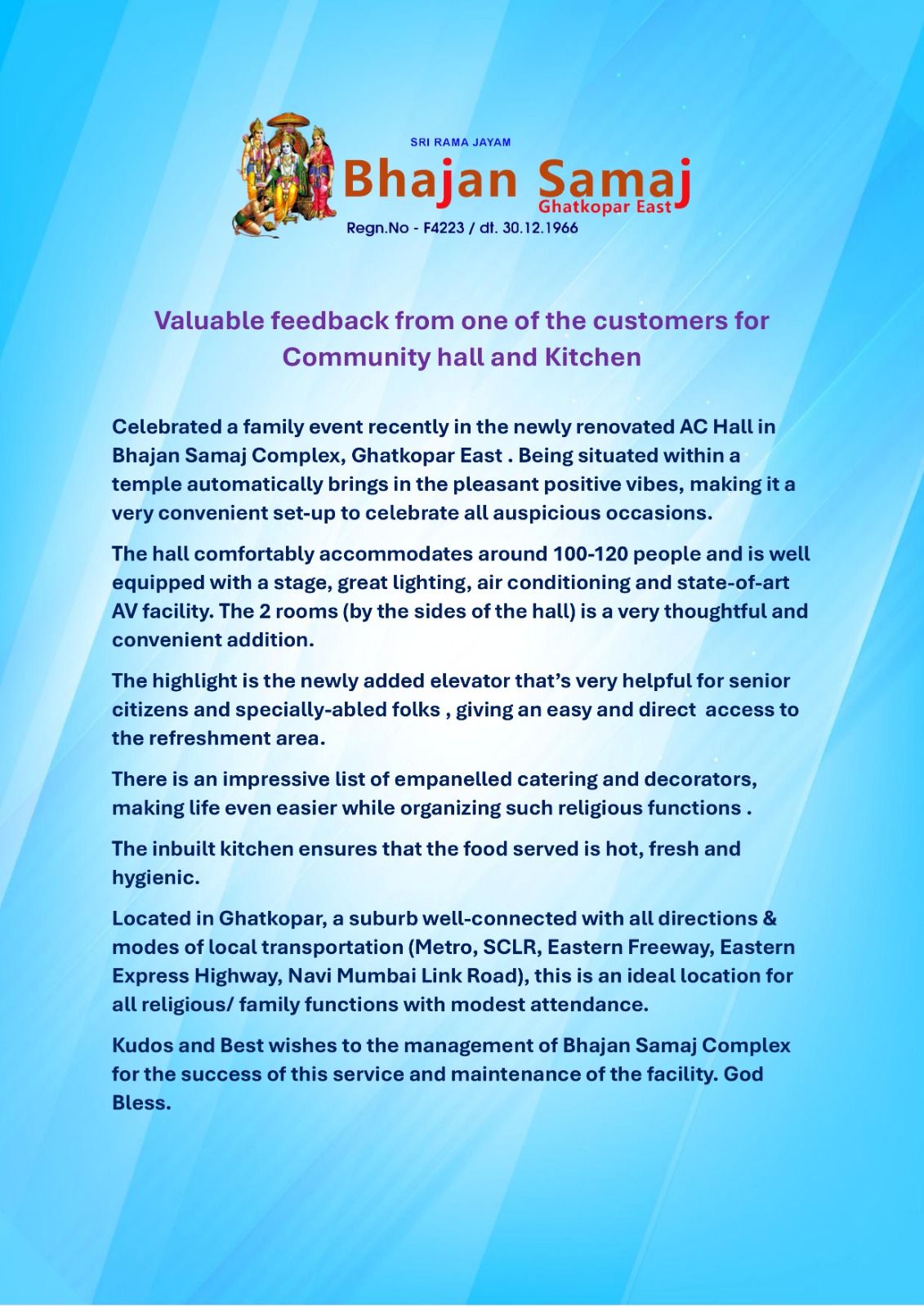 Family functions like Engagement, Marriage, Reception, Baby shower, 60th, 80th Birthday celebrations etc & all Family-Cultural-Spiritual needs, with a capacity of 130 to 150 persons.